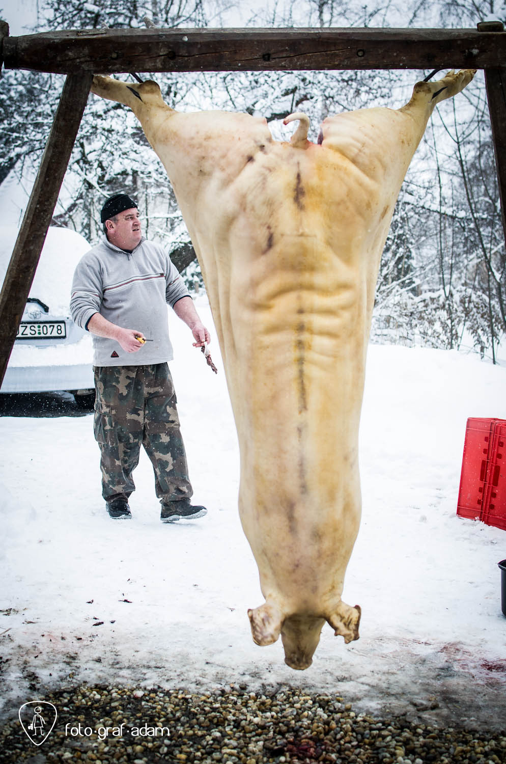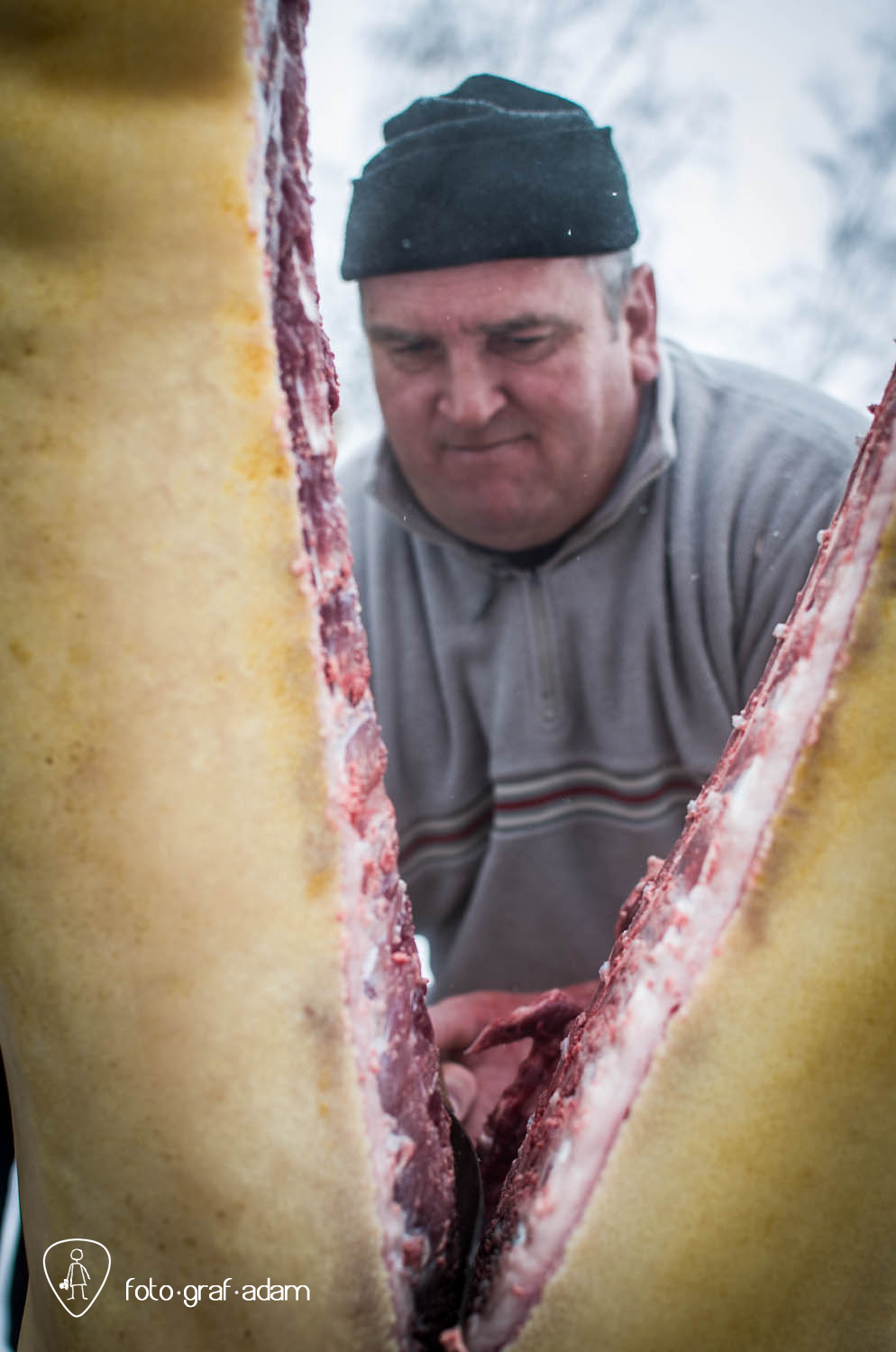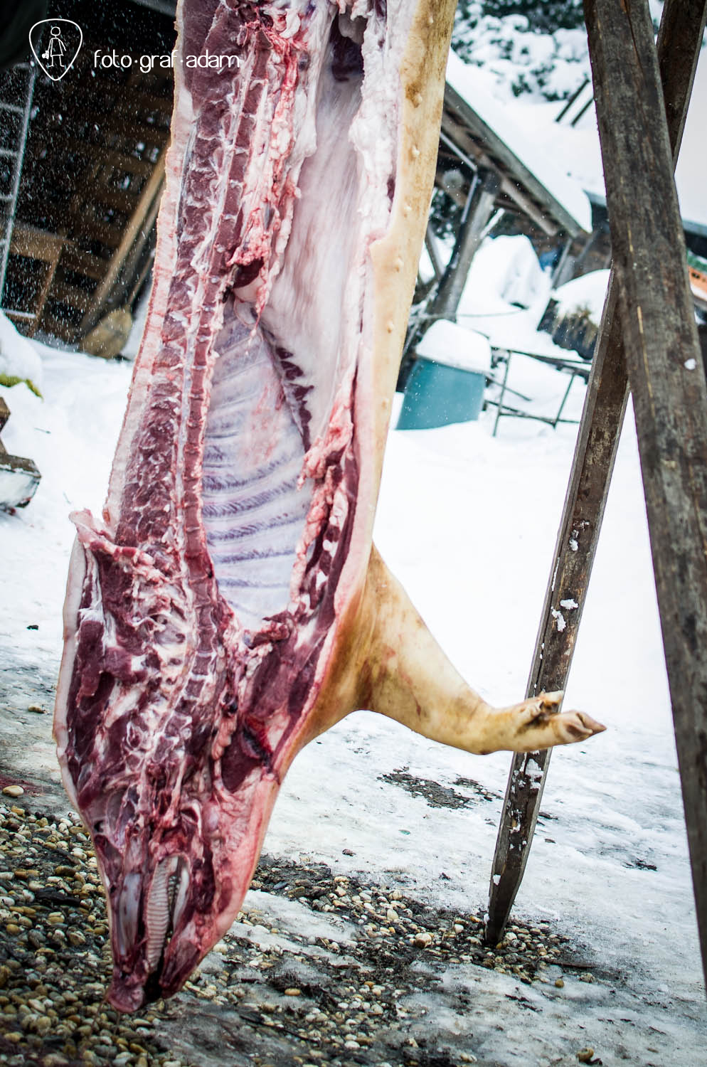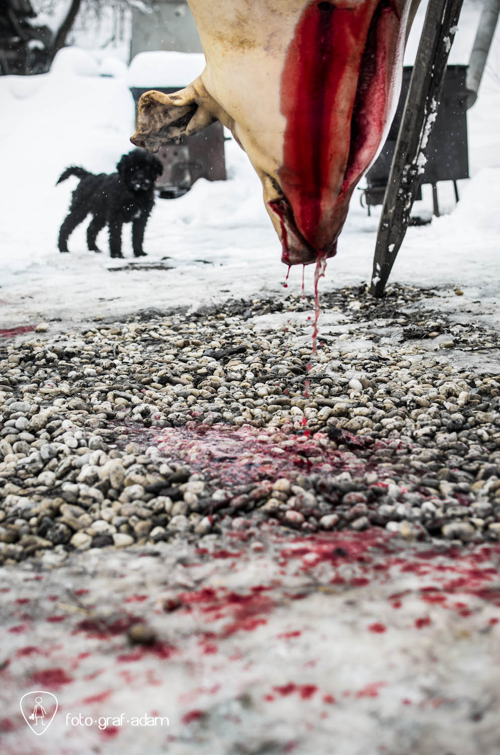 Talán kissé bántóan leplezetlen és túlzottan direkt képek, amiket most közzéteszek, jelen pillanatban mégis úgy gondolom, szükséges néha látnunk hasonlókat. Mert itt egy élet kimúlt, akárhogy is vesszük. Félreértés ne essék, nem ítélkezni akarok, mert én magam is megeszem a jó kolbászt, a kenőmájast, ellenben nem sok hasonlót láttam. Éppúgy érzelgősködni sem szeretnék, ahogy szerencsére a helyszínen sem reagáltam túl a dolgot, de valahogy a történések mégis hatottak rám, és a látvány felnőtt fejjel való feldolgozásához szükségem volt a fotózás adta lehetőségekre, hogy interpretáljam a bennem zajló dolgokat, hogy mit nézek, mi érdekel, mire figyelek, mi rögzül.