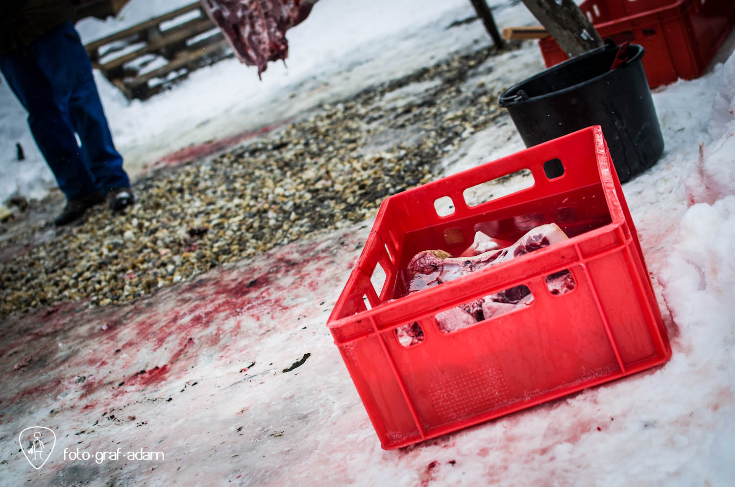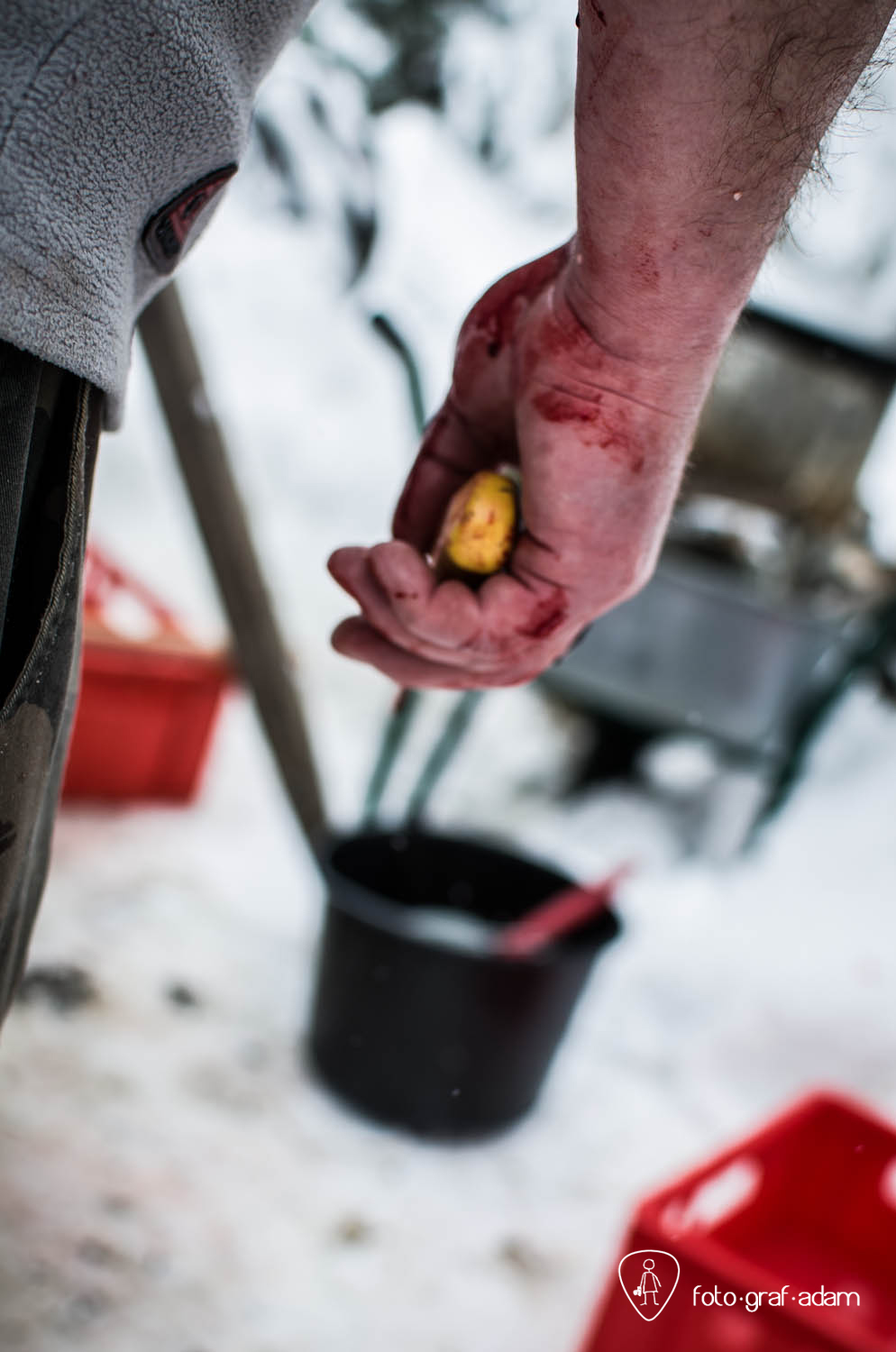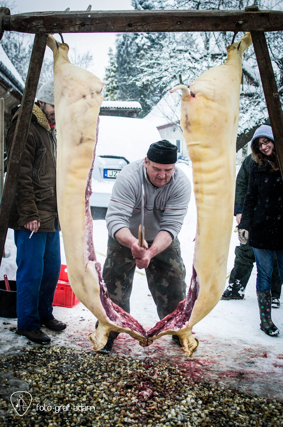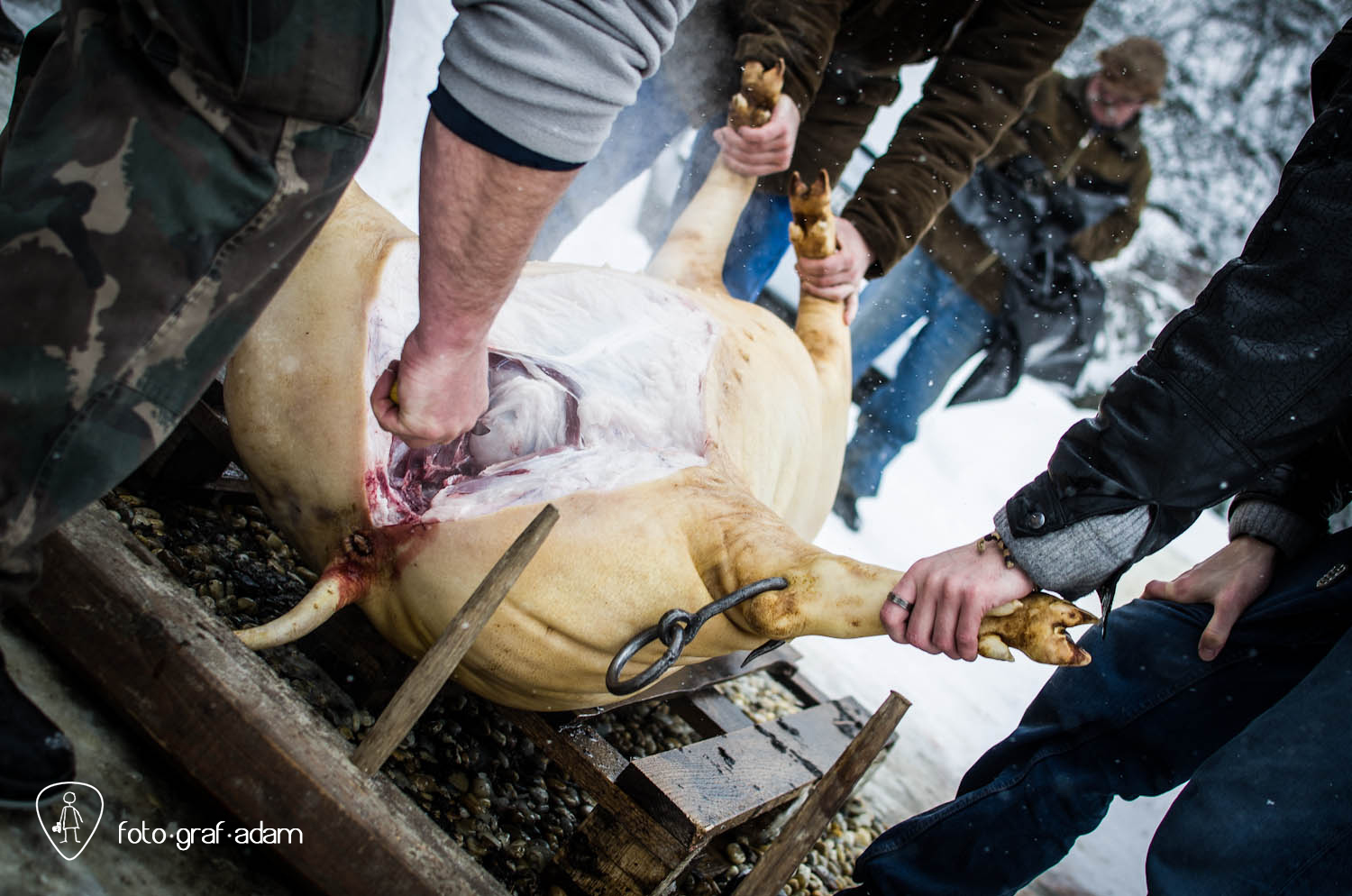 Talán kissé bántóan leplezetlen és túlzottan direkt képek, amiket most közzéteszek, jelen pillanatban mégis úgy gondolom, szükséges néha látnunk hasonlókat. Mert itt egy élet kimúlt, akárhogy is vesszük. Félreértés ne essék, nem ítélkezni akarok, mert én magam is megeszem a jó kolbászt, a kenőmájast, ellenben nem sok hasonlót láttam. Éppúgy érzelgősködni sem szeretnék, ahogy szerencsére a helyszínen sem reagáltam túl a dolgot, de valahogy a történések mégis hatottak rám, és a látvány felnőtt fejjel való feldolgozásához szükségem volt a fotózás adta lehetőségekre, hogy interpretáljam a bennem zajló dolgokat, hogy mit nézek, mi érdekel, mire figyelek, mi rögzül.