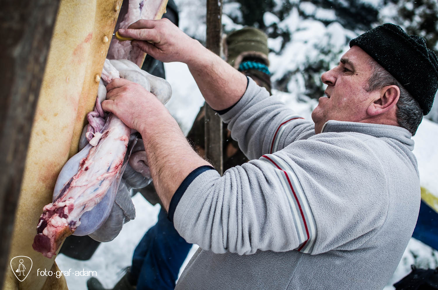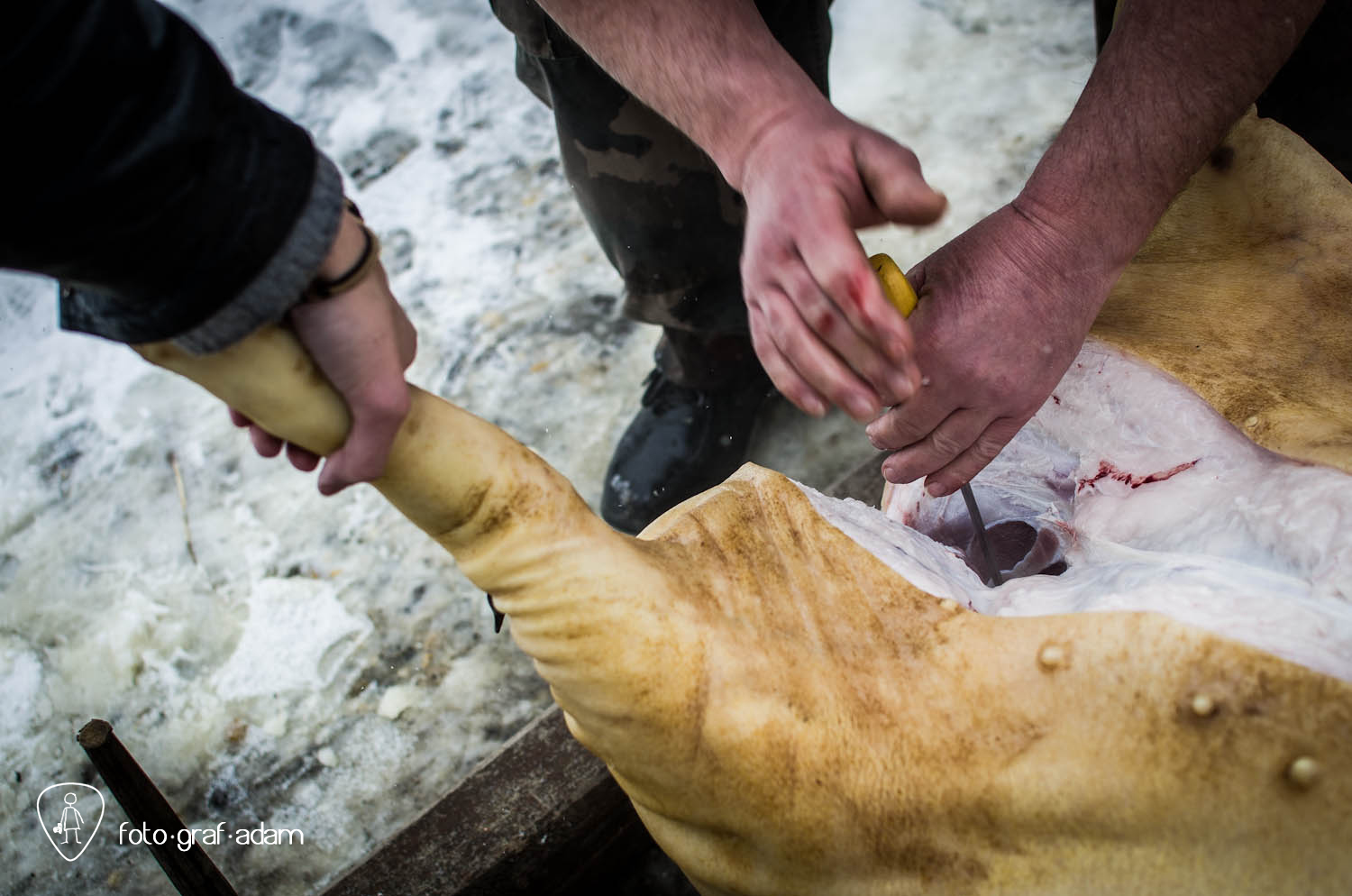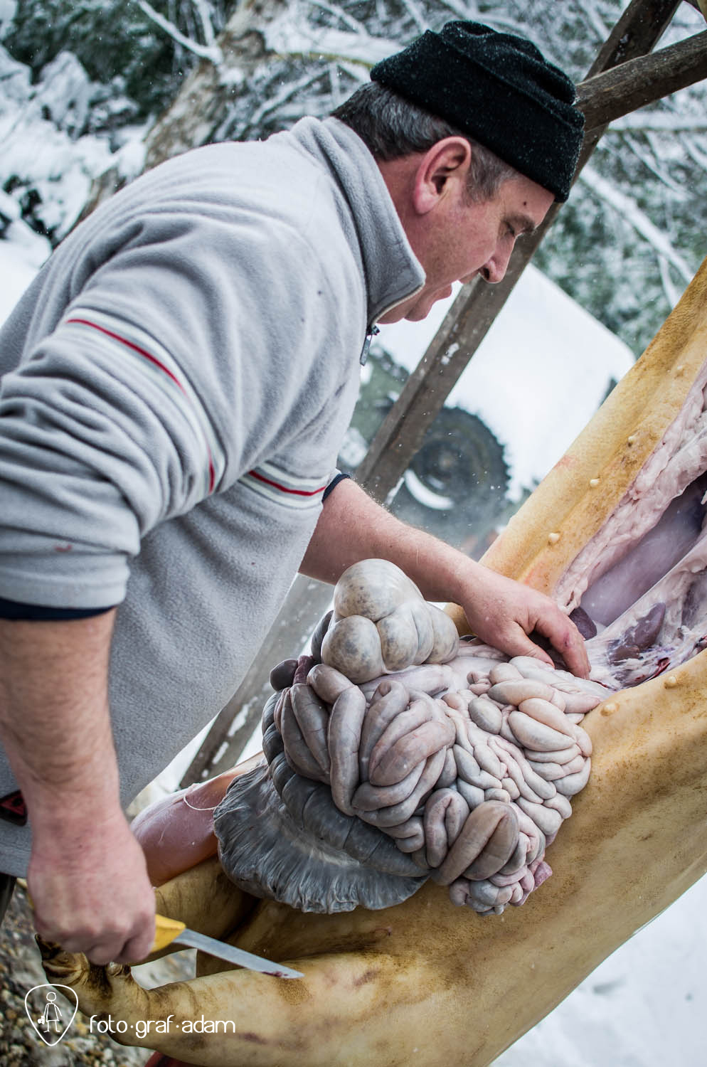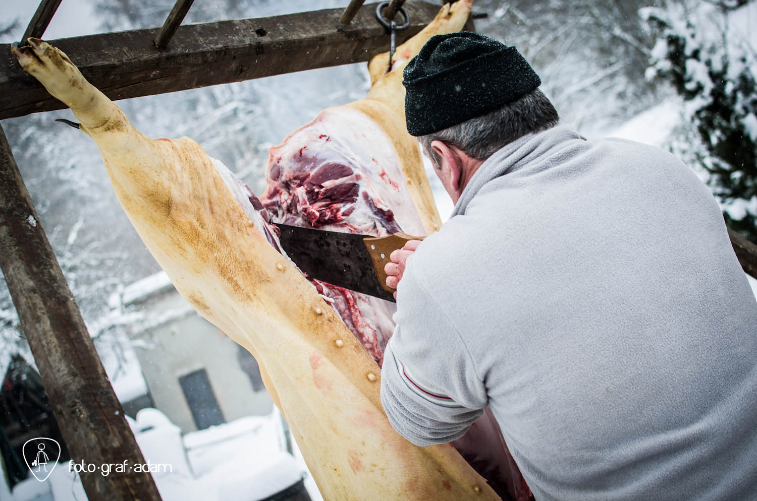 Talán kissé bántóan leplezetlen és túlzottan direkt képek, amiket most közzéteszek, jelen pillanatban mégis úgy gondolom, szükséges néha látnunk hasonlókat. Mert itt egy élet kimúlt, akárhogy is vesszük. Félreértés ne essék, nem ítélkezni akarok, mert én magam is megeszem a jó kolbászt, a kenőmájast, ellenben nem sok hasonlót láttam. Éppúgy érzelgősködni sem szeretnék, ahogy szerencsére a helyszínen sem reagáltam túl a dolgot, de valahogy a történések mégis hatottak rám, és a látvány felnőtt fejjel való feldolgozásához szükségem volt a fotózás adta lehetőségekre, hogy interpretáljam a bennem zajló dolgokat, hogy mit nézek, mi érdekel, mire figyelek, mi rögzül.